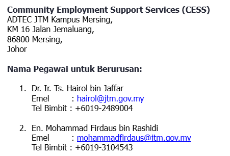 Permohonan Kursus Jangka Pendek boleh dibuat secara atas talian sepanjang tahun 2025. Sebelum membuat sebarang permohonan secara online, saudara- saudari perlu melayari maklumat kursus separuh masa di pautan Katalog Kursus Jangka Pendek (KJP) 2025. Sekiranya terdapat pertanyaan, sila berhubung dengan pegawai CESS untuk sebarang pertanyaan lanjut: